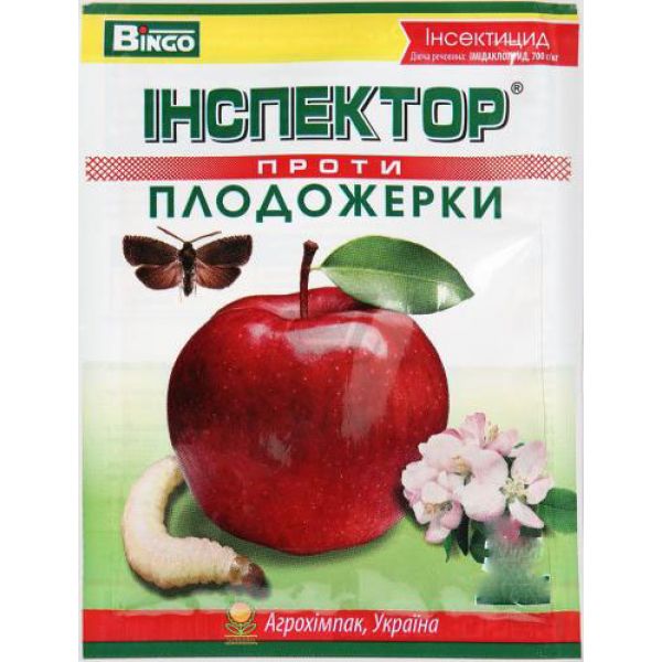 Препарат Инспектор представляет собой инсектицид системного и контактного действия против листогрызущих и сосущих вредителей сада. Данное средство применяется для опрыскивания яблони и других плодово-ягодных деревьев от плодожорки и других вредителей сада. Действующее вещество данного препарата - имидаклоприд. Благодаря системному действию, препарат поглощается растениями и распространяется по всем частям, уничтожая вредителей даже под листом и в других труднодоступных местах где находятся личинки и гусеницы. Имидаклоприд проникает в сосудистую систему растения и распределяется во все его части. Питаясь растением и растительным соком, вредители получают дозу имидаклоприда, которая оказывает пагубное воздействие на центральную нервную систему насекомых, в результате чего у них развиваются конвульсии и паралич, а затем наступает гибель. Препарат обладает длительным защитным действием до 30 дней, в зависимости от вида вредителей и погодных условий. Инсектицид Инспектор эффективно применяют для опрыскивания яблони, груши, сливы, персика, абрикоса, айвы, черешни, вишни, грецкого ореха и других садовых деревьев от листо-минирующих молей, листовертки, яблоневой плодожорки, яблоневого цветоеда, калифорнийской щитовки, тли и других вредителей сада.