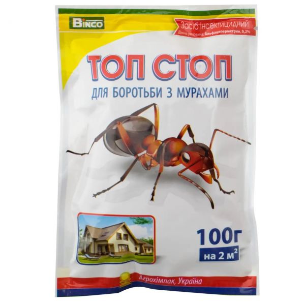 Инсектицидное дезинфицирующее средство в форме кристаллов для уничтожения всех видов муравьев в среде жизнедеятельности человека; для профилактической дезинфекции жилых, производственных, пищевых, учебных, санитарно-бытовых и подсобных помещений; в местах массового отдыха и рекреационных зонах; в подвалах, погребах, подсобных помещениях. Препарат содержит денатониум бензоат - горькое вещество во избежание употребления препарата детьми и животными, а также альфациперметрин в качестве действующего вещества. Механизм действия альфациперметрина основан на поражении двигательных центров насекомых, что приводит к параличу и последующей гибели. Контакт муравьев с кристаллами обеспечивается благодаря наличию сахара в составе кристаллов. Инсектицидные кристаллы Топ Стоп эффективно и надолго избавят вас от надоедливых муравьев.